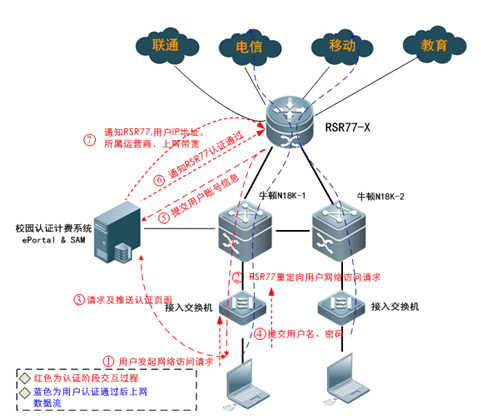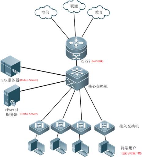 Server发过来的用户认证信息,并向Radius Server发起认证请求,根据认证结果设置用户是否可以上网,同时向Portal Server反馈认证结果。NAS可以为接入设备、汇聚设备或者是出口设备。