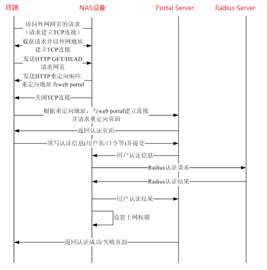 4) NAS设备使用radius协议向Radius Server发起认证。认证结束后NAS设备使用portal协议将认证结果反馈给Portal服务器。
