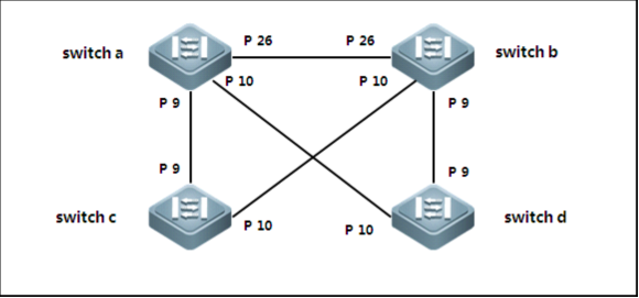 3、switch a, switch b, switch c, switch d都启用MSTP多生成树协议,并且所有设备都属于同一个mst域, 且实例映射一致(VLAN10,20映射实例1, VLAN30,40映射实例2,其它VLAN映射默认实例0)。