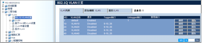 3)将端口9,10,26分别以tagged方式加入VLAN10,20,30,40。