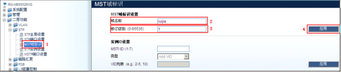 RG-NBS5526XG:15#config stp mst_config_id name ruijie revision_level 1------>配置MSTP的域名称为ruijie,修订级别为1