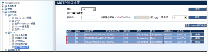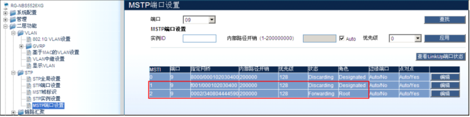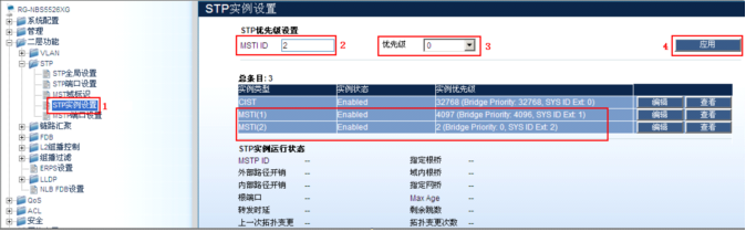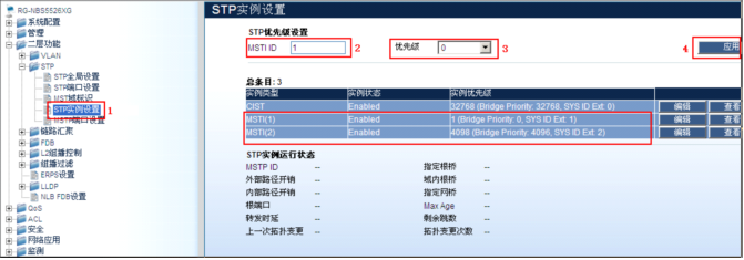 RG-NBS5526XG:15#config stp priority 4096 instance_id 2------>配置MSTP实例2的优先级为4096