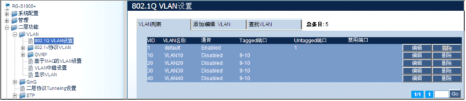 3)将端口9,10分别以tagged方式加入VLAN10,20,30,40。