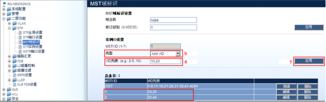 RG-NBS5526XG:15#config stp instance_id 1 add_vlan 10,20------>将VLAN10、20映射到MSTP实例1