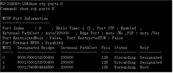 RG-NBS5526XG:15#config stp priority 0 instance_id 2------>配置MSTP实例2的优先级为0