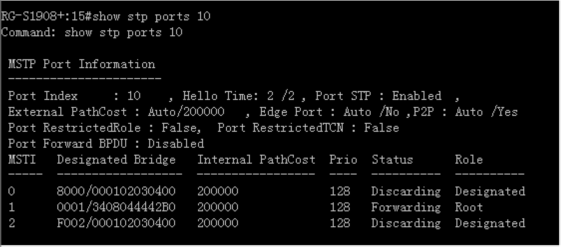 注:该命令可以查看端口的STP状态,如果需要查询MSTP更详细的信息,可以使用命令“show stp instance”