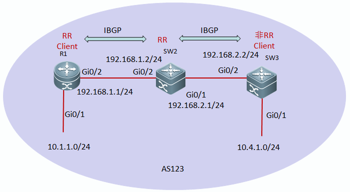 如下网络拓扑,由于IBGP邻居的水平分割,R1、SW3无法学习到对方的BGP路由,需要通过配置路由反射器,解决IBGP邻居水平分割的问题。