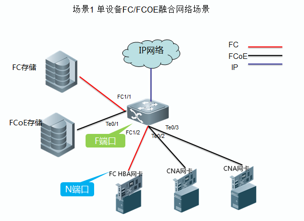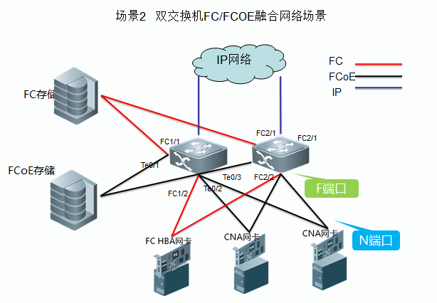 FC/FCOE的组网相对简单,将存储和服务器的接口直连到交换机上即可,交换机实现FC/FCOE网络的互联互通。