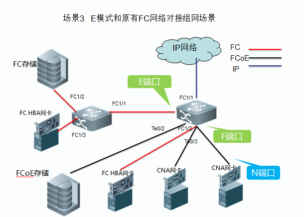2、使用FC-E模式连接客户原有FC网络(典型代表Cisco FC交换机)(E模式可以理解为FC路由)