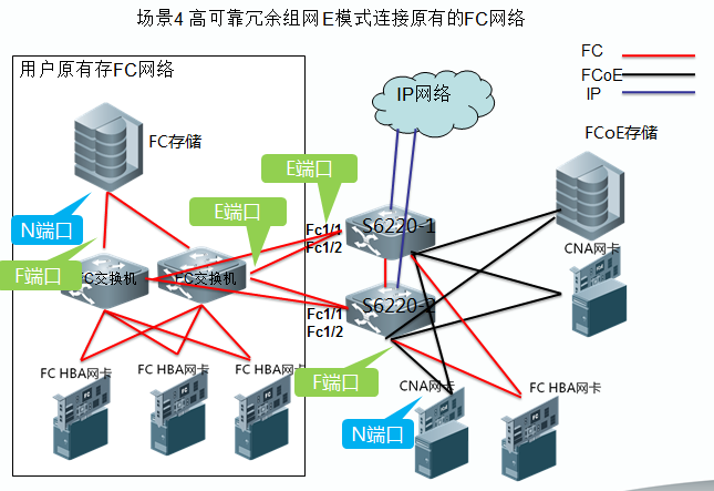 3、推荐将S6220与原有的FC网络进行全连接(全连接能起到冗余备份作用,提供多条路径),