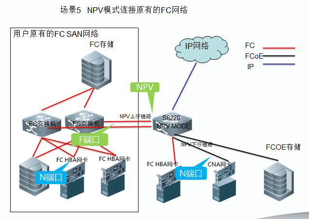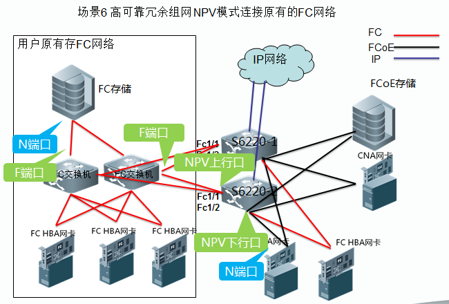 NATAPP)带支持FCOE功能的CNA卡和支持FC功能的HBA卡,存储的主备控制器均接入S6220设备。