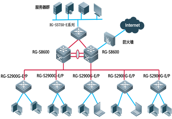 S2900-E/P系列交换机上行通过千兆连接锐捷的多业务IPv6核心路由交换机S8600系列,核心通过万兆或多千兆链路聚合相连;S2900-E/P系列向下通过千兆连接桌面工作组,实现全千兆到桌面。