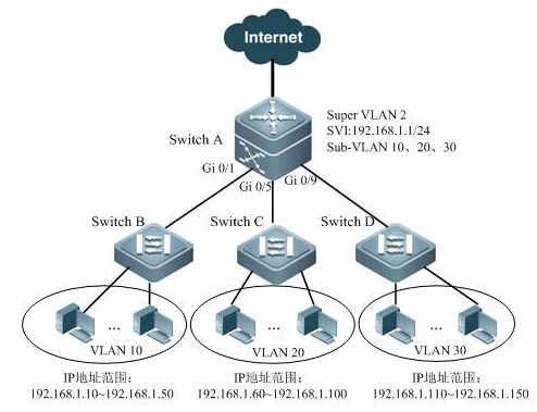 VLAN内的各个Sub VLAN之间是二层隔离的,即Sub VLAN内的用户之间不能通信;如果Super VLAN配置了SVI,通过Super VLAN的网关作为ARP代理,同一Super