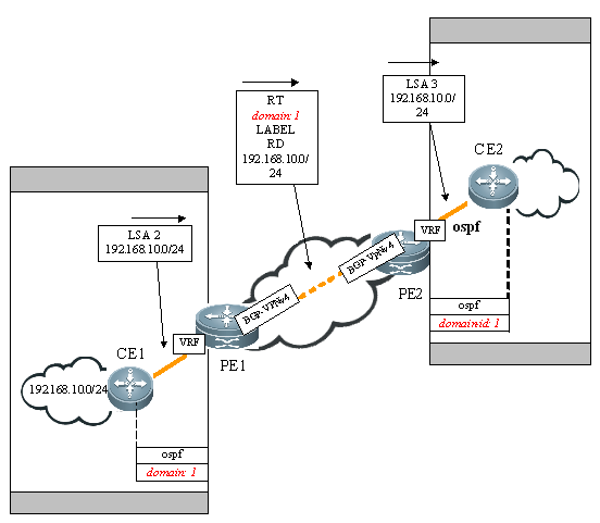 如下图所示,对于属于同一个OSPF域内部的路由,CE1把路由以2类LSA通告给PE1,并形成VPN路由通告给PE2,PE2接收到该路由并重分布给VRF