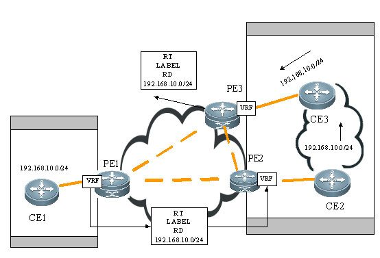 如下图所示。192.168.10.0/24的路由PE1通告给PE2和PE3,CE2通过OSPF协议通告给CE3,再由CE3通告给PE3,重分布给PE3的BGP协议,PE3上优选了OSPF重分布来的协议,并把该路由转化为VPN-IPV4路由通告出去,就有可能产生环路,如下图所示。