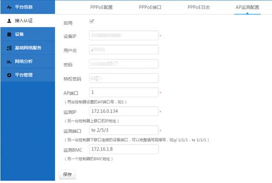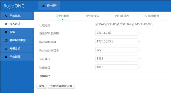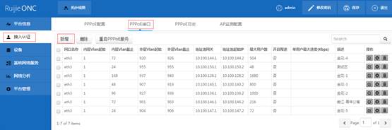 在【接入认证】的【PPPoE接口】栏中,可以对下挂的接入用户进行PPPoE客户端终结的配置设置,其中可以配置:内外侧Q、网关、Pool池、用户限速、描述等。