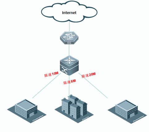 某机构各分支通过MSTP线路连接至核心交换机,共享统一上网出口。由于各个分支机构规模不一样,管理员希望对各个分支机构连接的端口限定上行和下载速率。
