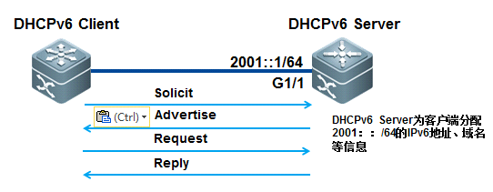 客户使用交换机作为DHCPv6客户端从 DHCPv6服务器获取 IPv6地址前缀,以及网络配置参数:DNS服务器地址、域名。