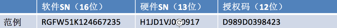 (1)请参照以下表格范例收集软件SN、硬件SN和授权码