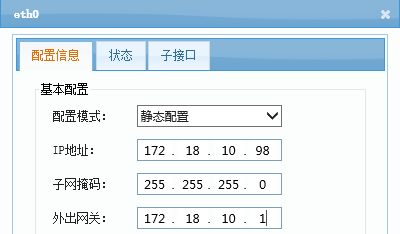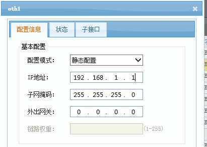 2)配置外网接口IP:外网接口要设置出口的网关地址,无需再设置默认路由