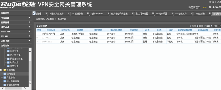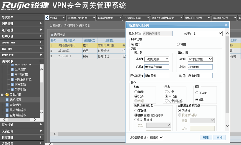 (注:初始化的V1600S默认产生以下两条访问规则,序号为1的安全规则是对任何数据都是放通,不进行任何的修改,序号为2的安全规则是对任何数据都进行阻断;访问规则的处理顺序是由上往下,从第一访问规则开始匹配,如果新增加了访问规则,记得根据实际的网络需求调整好规则之间的顺序)