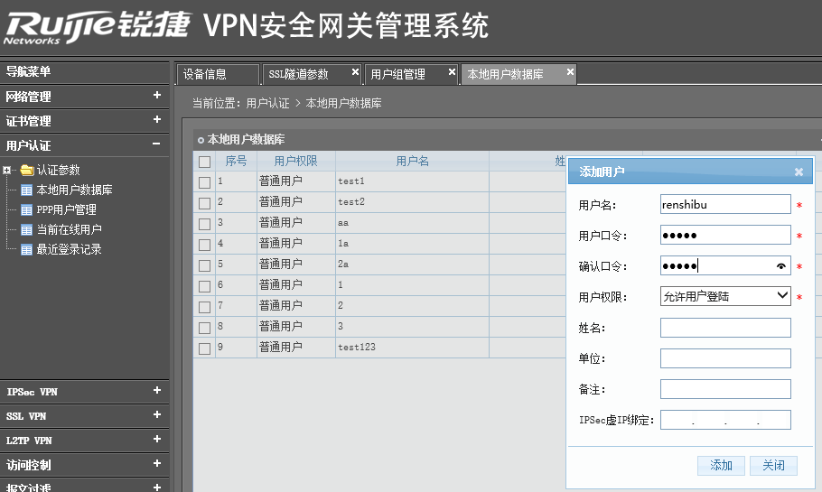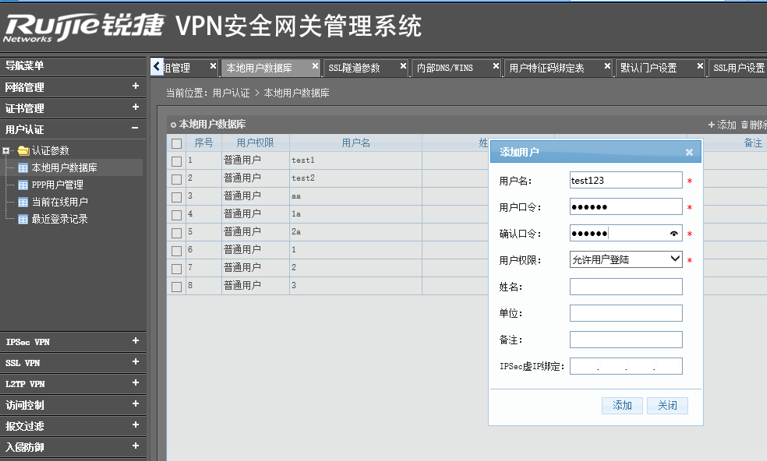 点击 “本地用户数据库” 添加新用户,此处添加用户名为test123,密码123456的一个账户