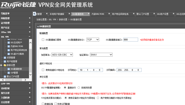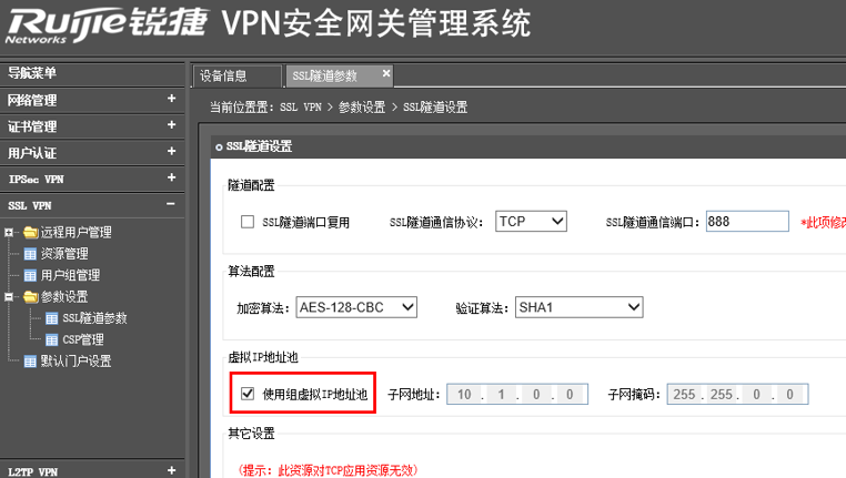 参数中主要配置虚地址池,虚地址池的作用是:用户建立隧道时,VPN网关设备从该地址池从分配其中的某个IP地址给外网VPN用户使用;