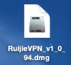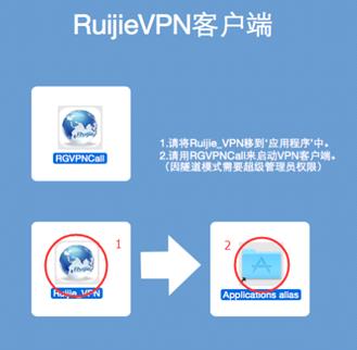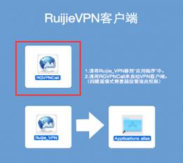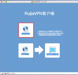 根据界面提示将Ruijie_VPN移动到“应用程序”中;(鼠标左键选中图中1号红色圈圈处拖拽到2号红色圈圈处即可)