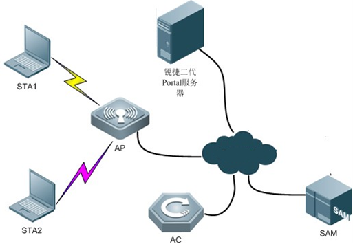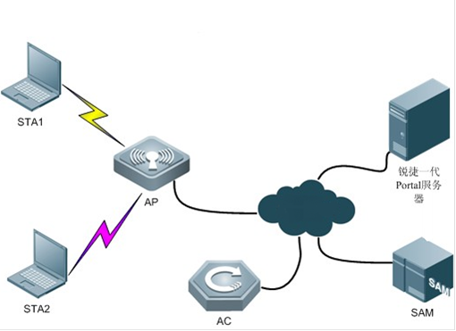 b、接入设备(AC/AP):在网络拓扑中一般是接入层设备(例如在无线网络中可以是无线AC),一般与用户终端设备直接相连接,在接入设备上需要启动Web认证功能。接入设备接收Portal