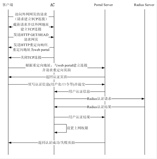 Server发过来的用户认证信息,并向Radius Server发起认证请求,根据认证结果设置用户是否可以上网,同时向Portal Server反馈认证结果。
