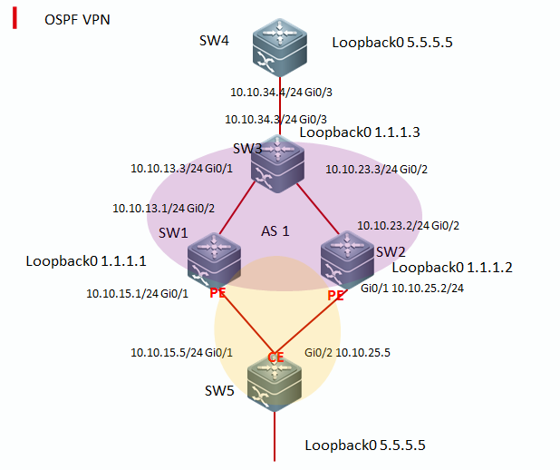 ÍØÆËÄ£ÄâMPLS-VPN CEË«¹éÊô»·¾³£¬CEÓëPE¼äÔËÐÐOSPFÐÒé¡£SW1/SW2/SW3ΪPE£¬SW4/SW5ΪCE¡£