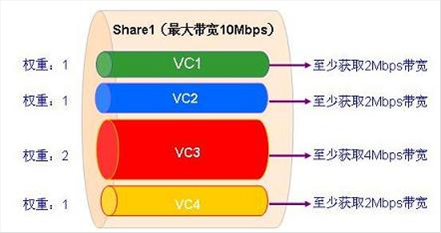 例如,设置VC1、VC2、VC3和VC4的最大带宽均为5Mbps,并将其纳入Share1中,设置权重分别为1、1、2、1,Share1的最大带宽为10Mbps,则表示在Share1中,VC1至少获取的带宽为10*1/5=2Mbps,依次类推,VC2、VC3和VC4至少获取带宽分别为2Mbps、4Mbps和2Mbps。